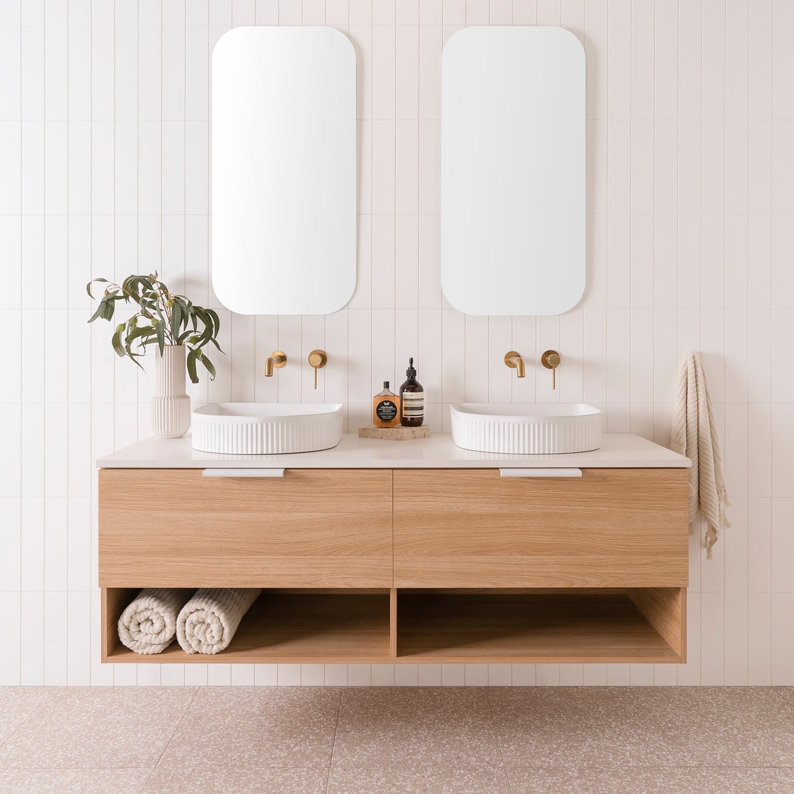 Choose from Ceramic or Cast Marble moulded tops (0, 1 or 3 tap hole available) or benchtop options (no extra charge for basin & tap hole cut-out).