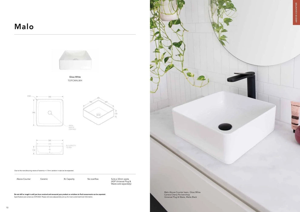 Due to the manufacturing nature of ceramic, size variation (+/-5mm) is to be expected. Dimensions are nominal, please measure your basin prior to installation.