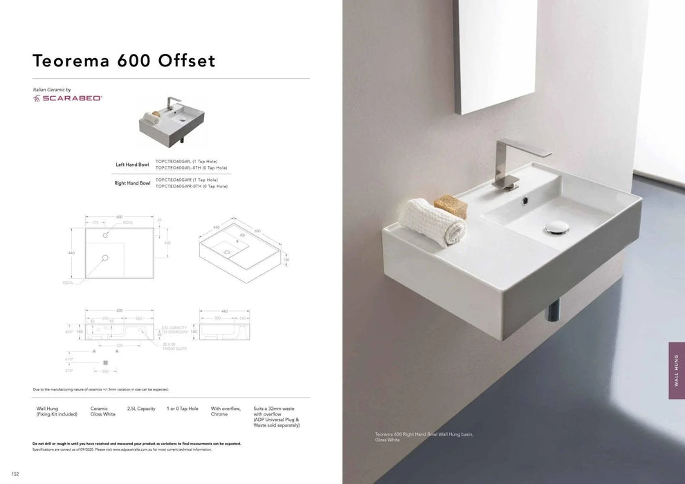 ADP Teorema 600mm Ceramic Wall Hung Basin