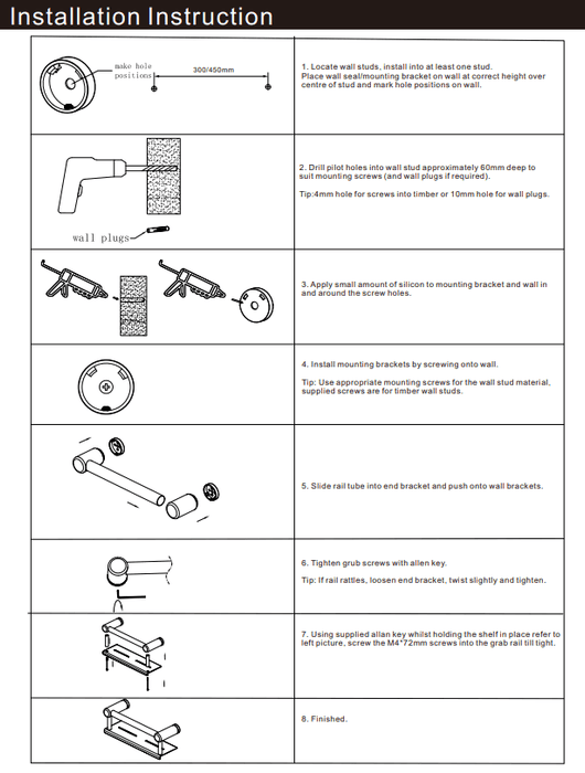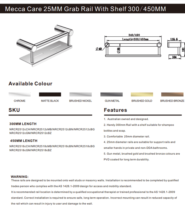 NERO MECCA CARE 25MM GRAB RAIL WITH SHELF 300MM BRUSHED NICKEL