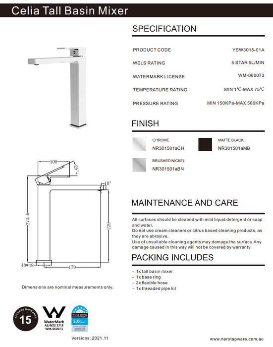 NERO CELIA TALL BASIN MIXER BRUSHED NICKEL